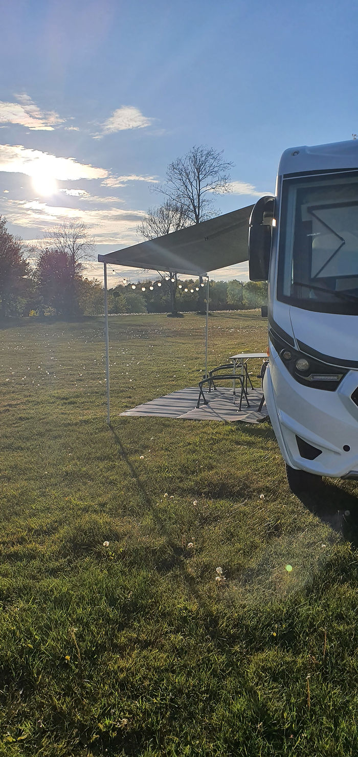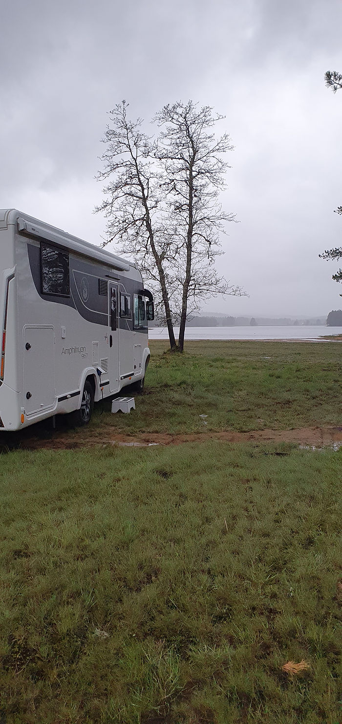Der var det en bobilparkering på en stor gresslette, og med strøm og tømmemuligheter.