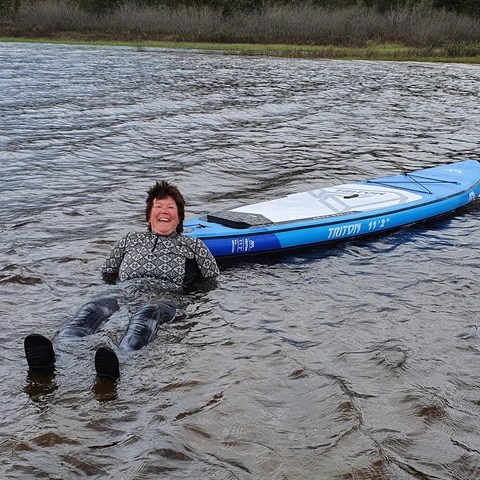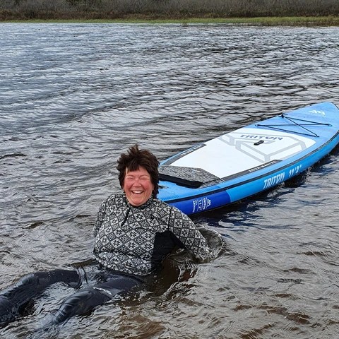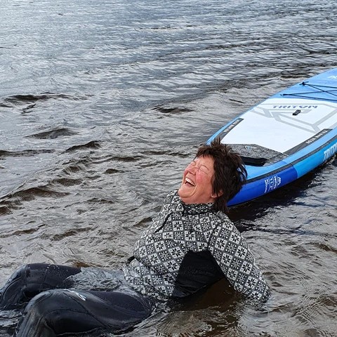 På ettermiddag var det tiden kommet for test av SUP-brettet. Selvfølgelig blåste det skikkelig pålandsvind og det gjorde det uheldigvis mye vanskeligere for meg.
