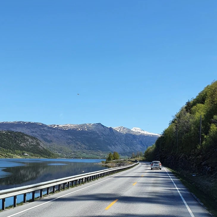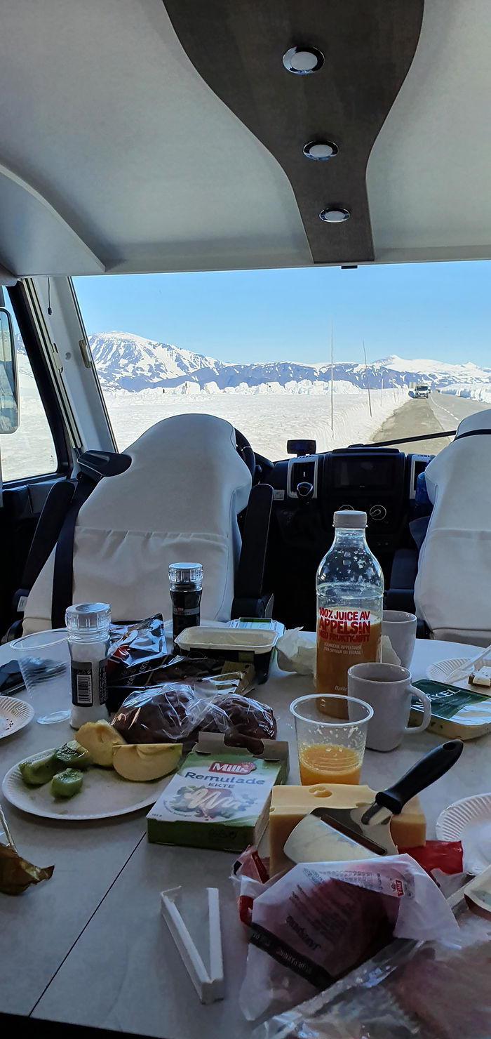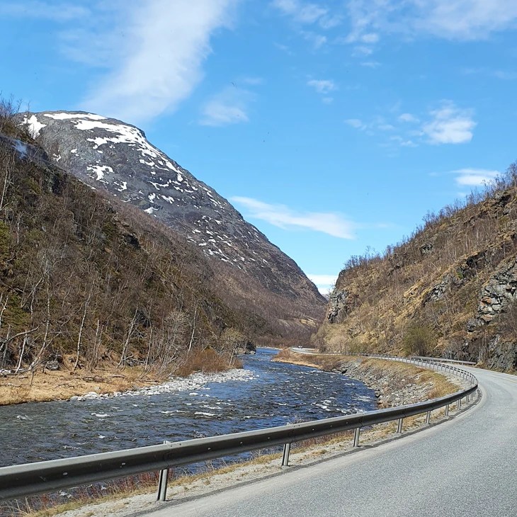 Tidlig neste morgen gikk ferden videre mot Trondheim. Vi kjørte avgårde i strålende solskinn og det var lite trafikk så tidlig på dagen. Veien gikk oppover E16 langs elven Begna til Fagernes, derfra Fv51 opp på Valdresflya. Der tok vi et godt stopp og spiste brunsj. Det var helt nydelig der med strålende solskinn og masse snø.