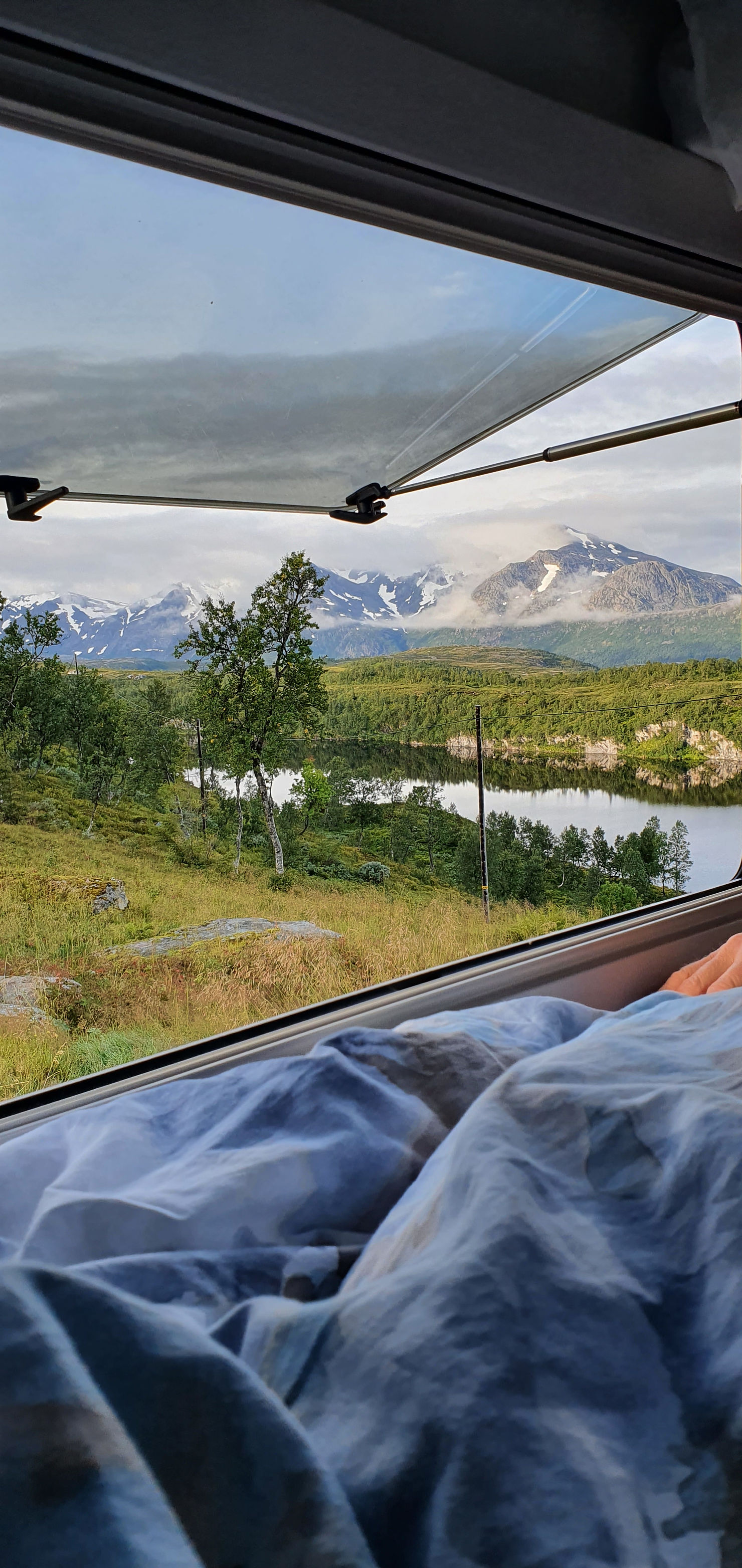Opp på Korgfjellet gikk veien videre. Der hadde vi sett oss ut en fricampingplass rett ved Korgen Fjellstue. Det viste seg å være et godt valg. Fredelig liten plass med fin utsikt ned på et vann. Der fant vi fort senga etter 12 timer på veien.