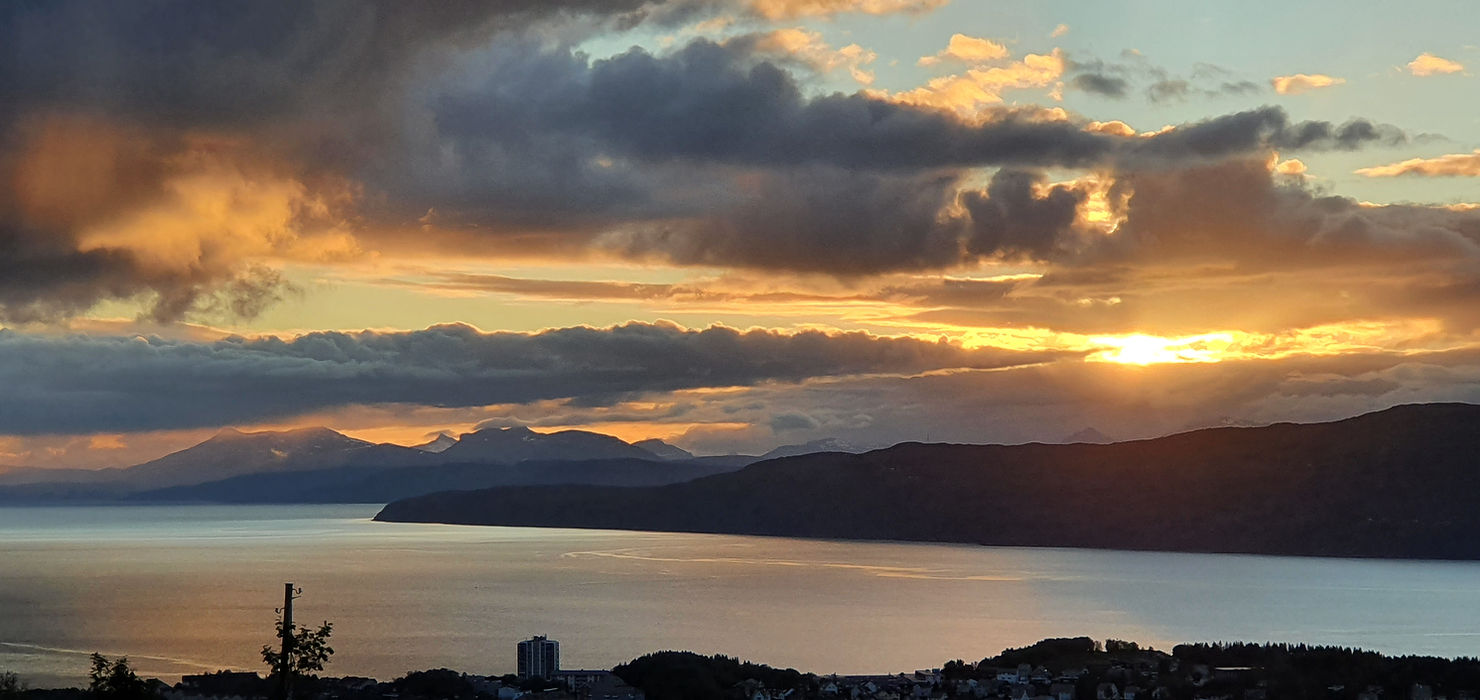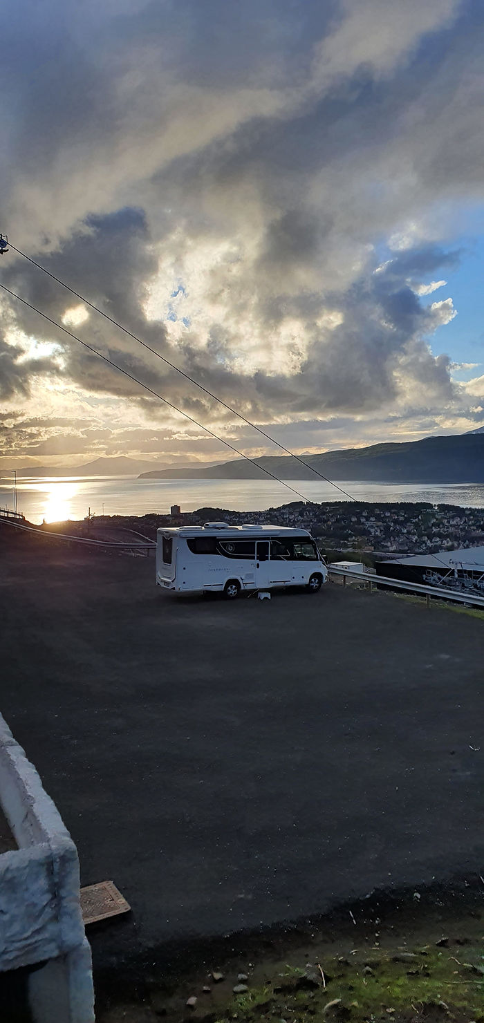 Den ligger ikke sentralt i sentrum, men med nærheten til naturen og med den utsikten er det verdt litt avstand til butikker, restauranter ol. Det ligger også en bobilparkering i sentrum, hvis man ønsker det.