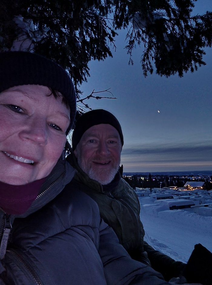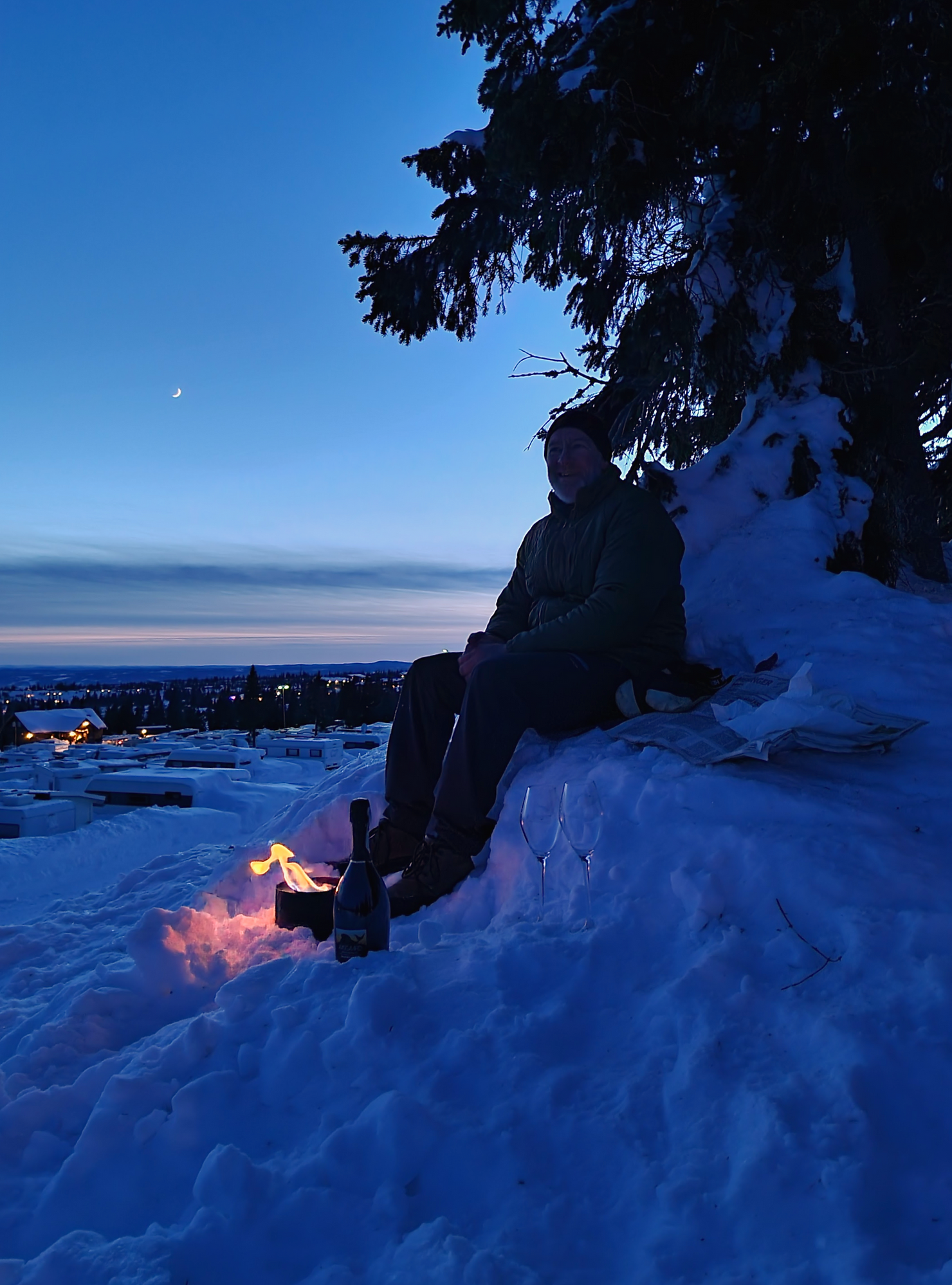 Vi kravlet oss opp på en høy brøytekant og satt der og nøyt kvelden.