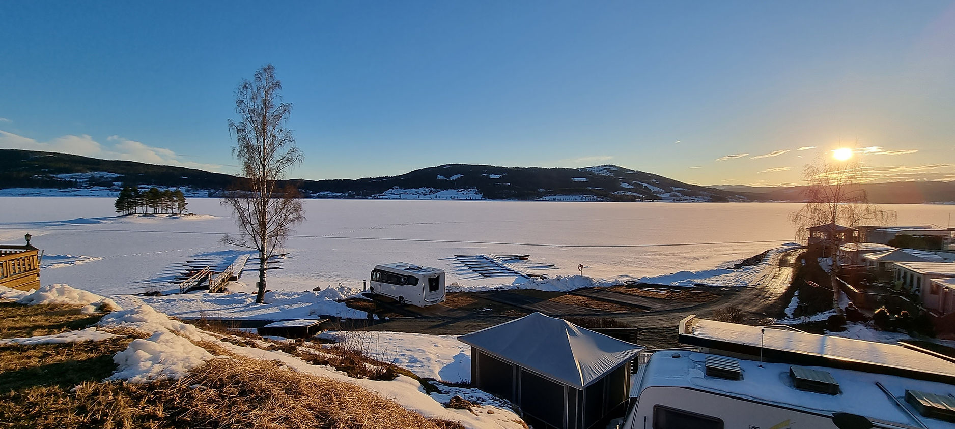 Campingen ligger veldig fint til ved Krøderen og det var kjempefine bobilplasser nede ved vannet.