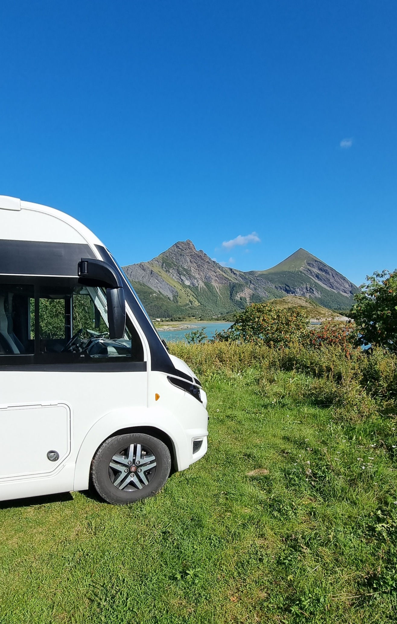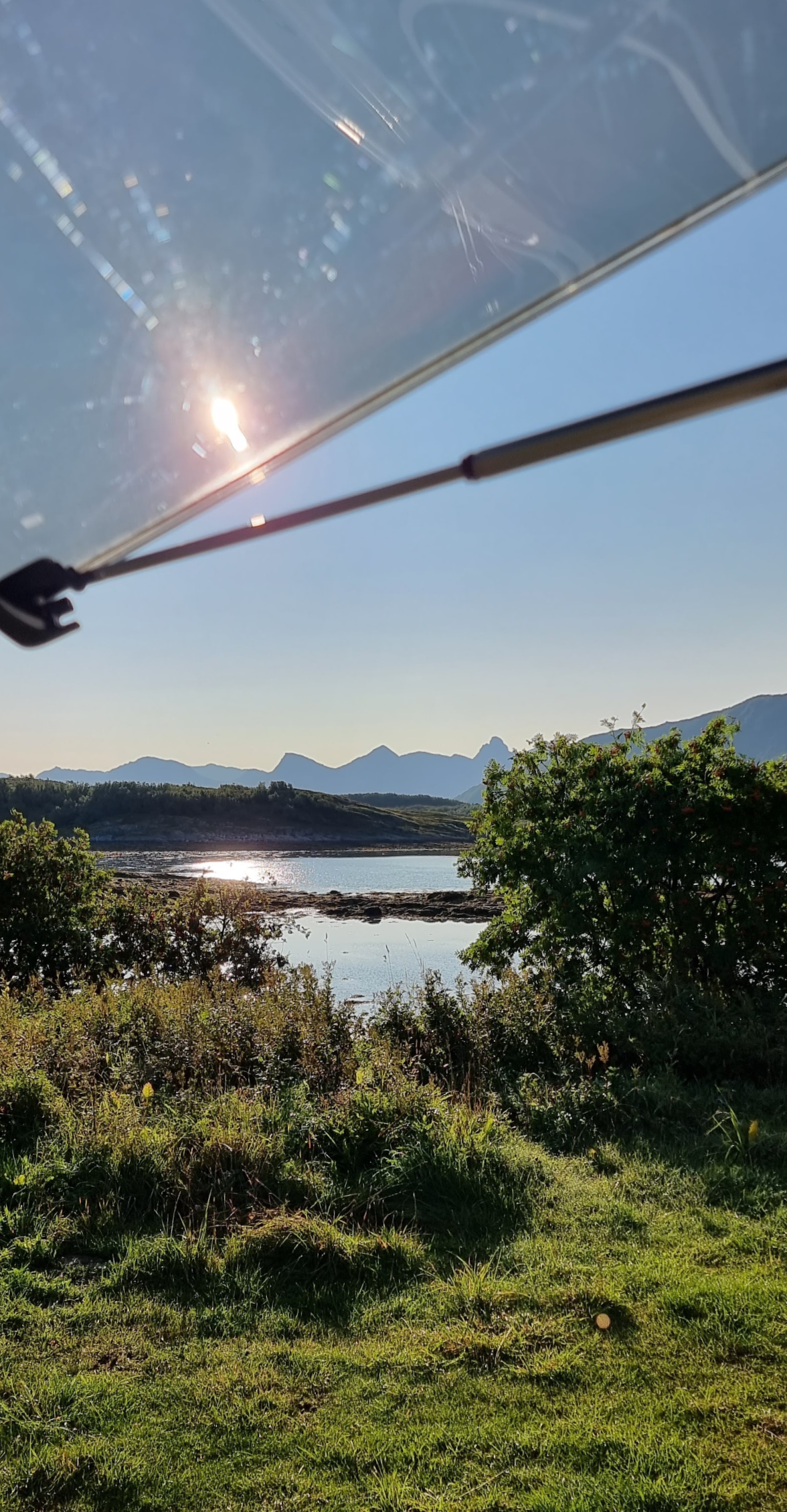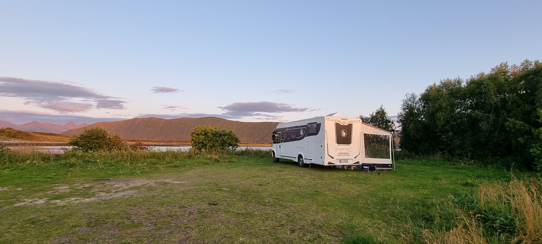Vi hadde sett oss ut ett par plasser vi vurderte å parkere på, bla. Bøsanden. På Bøsanden var det nå ikke lov til å stå med bobil. Så da var ikke det et alternativ. Det blåste veldig på den siden av Engeløya også, så vi bestemte oss for å kjøre tilbake mot Røssøya. Der fant vi en liten gressplass hvor det var bobilparkering. Det var en privat plass og vi bare vippset penger.
