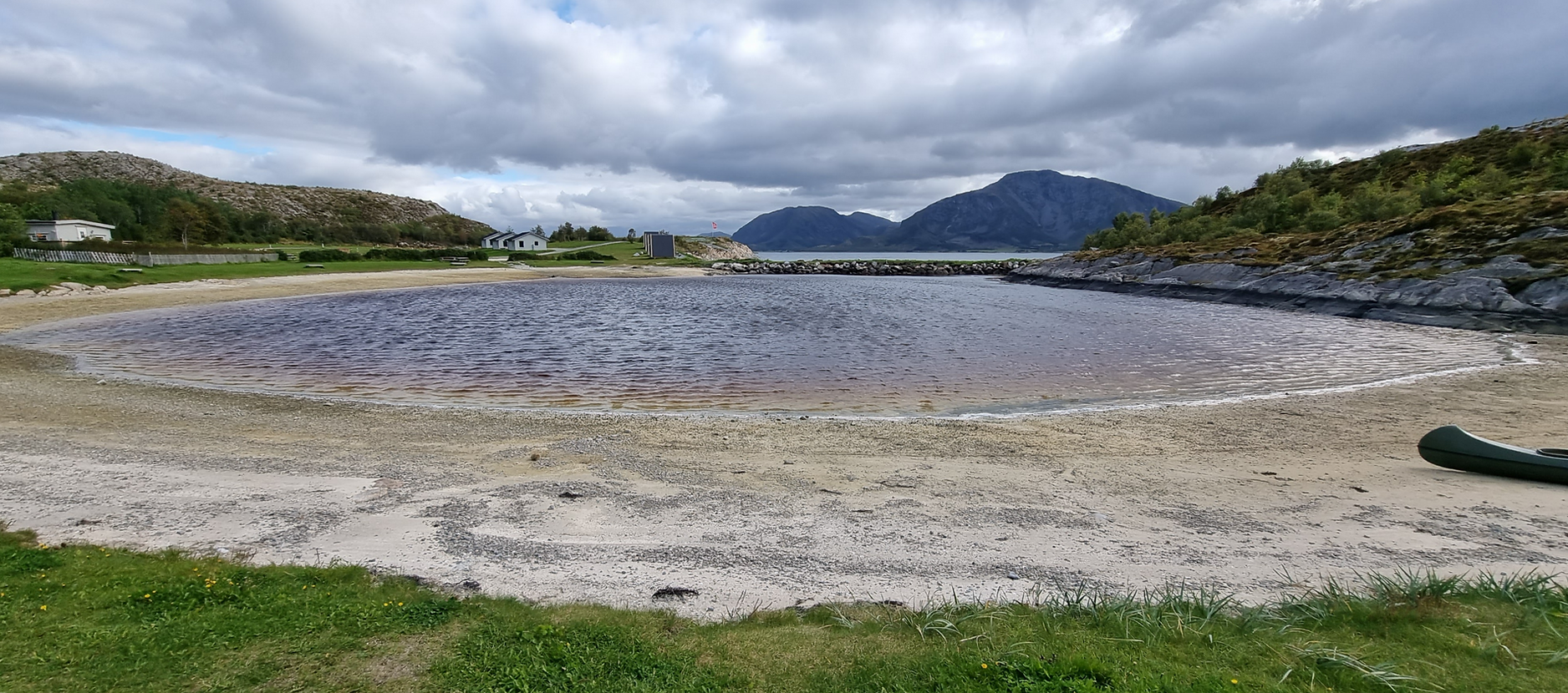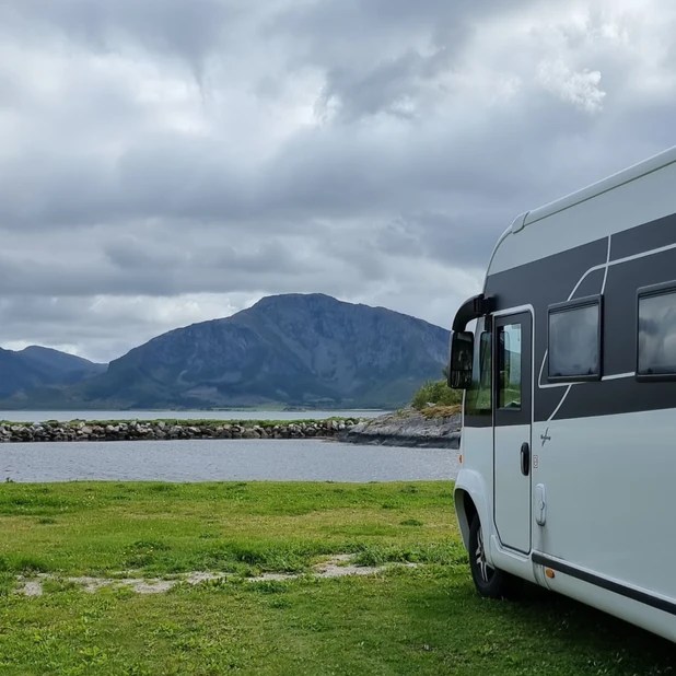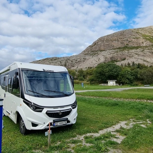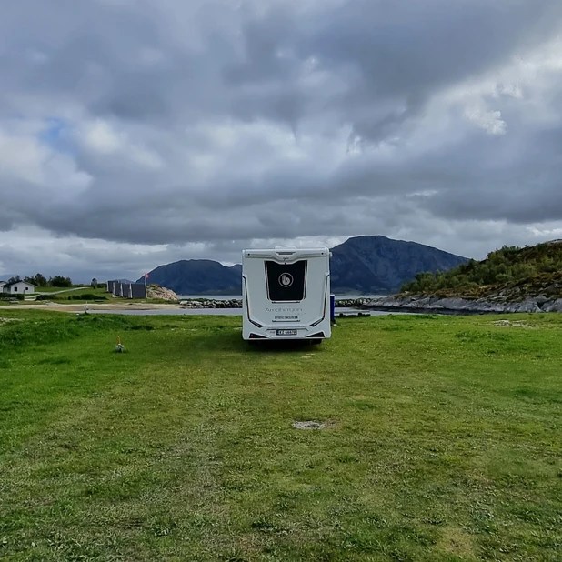 Vi kjørte til Torghatten camping og fant en fin plass der. Campingen var stengt for sesongen, men det var bare å parkere og betale via Vipps. Det var en veldig fin campingplass, flott beliggende ved foten av Torghatten.