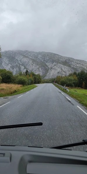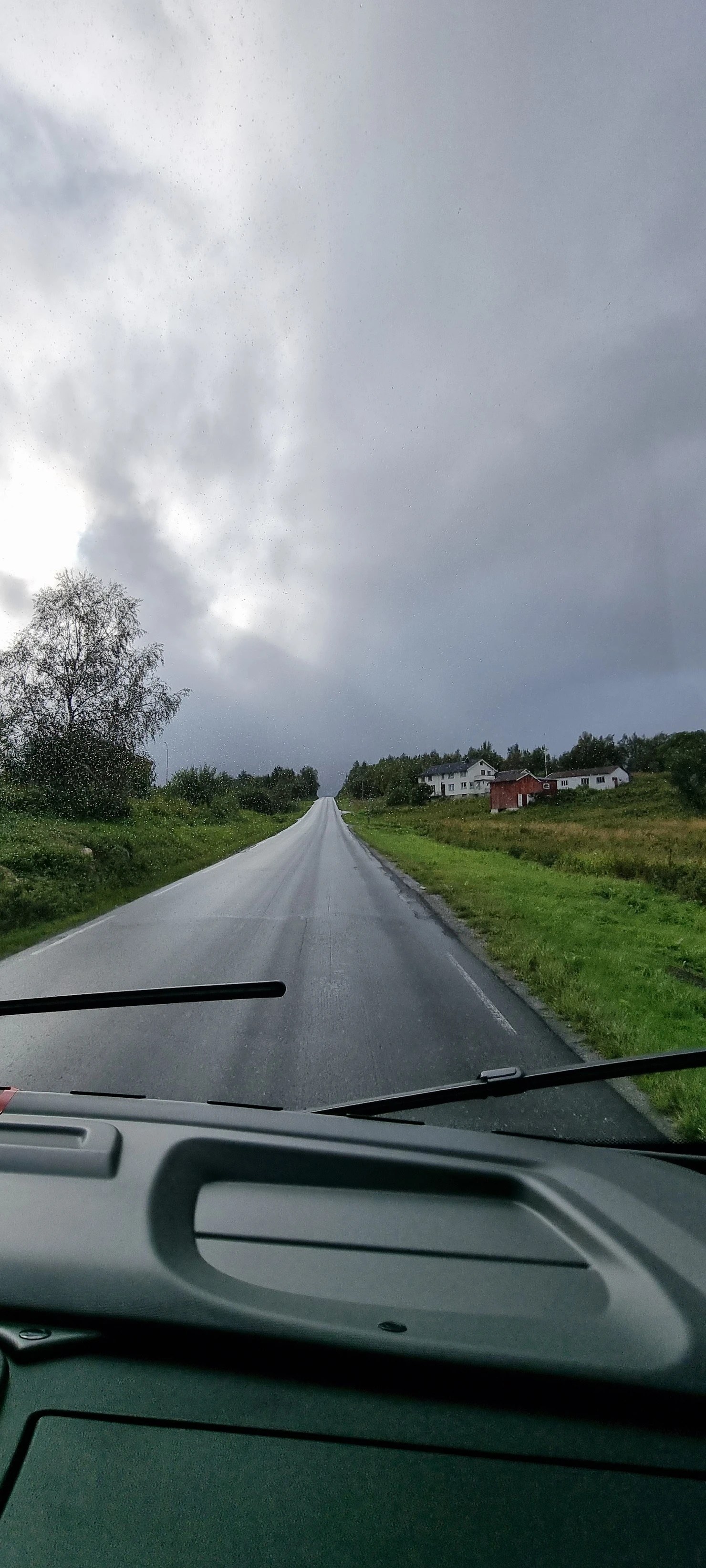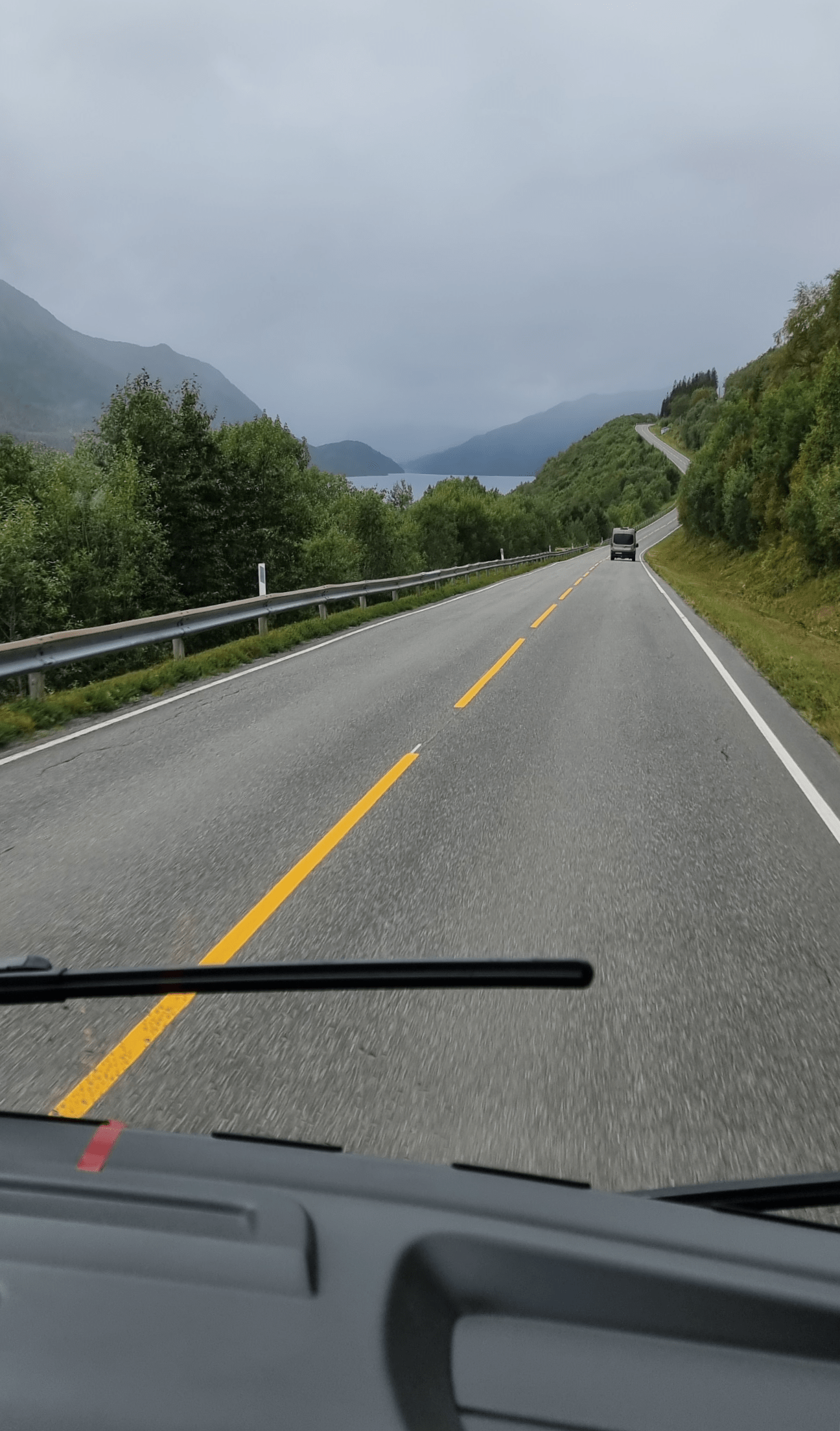 I tillegg hadde vi så dårlig vær med tåke og regn. Tåka og skydekke hang langt ned i fjæra og vi kunne bare gjette oss til hva som var rundt oss der vi kjørte avgårde.