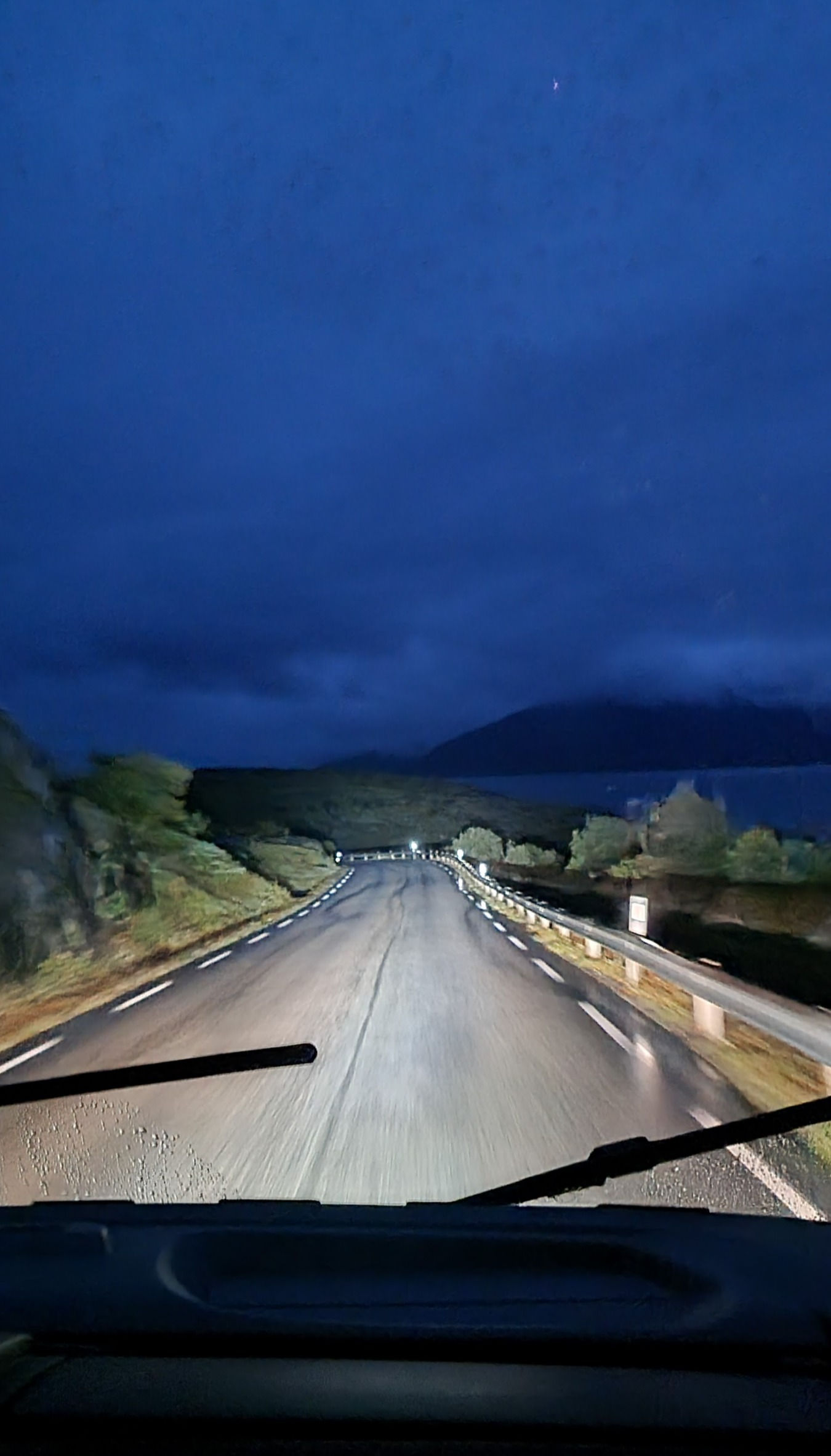 Vi kjørte i mørket og det var altså så bekkmørkt.