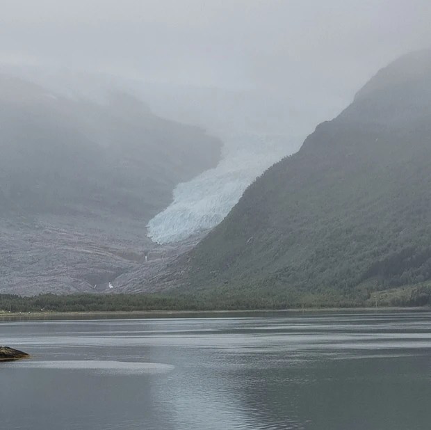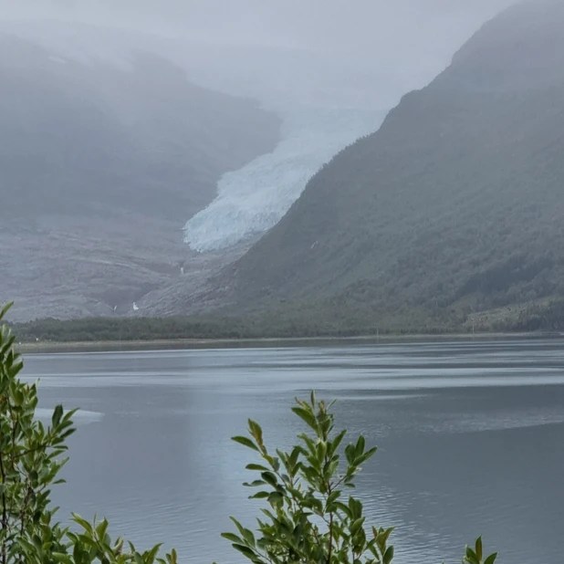 Vi trodde vi så Svartisen langt borte i tåka. Vi tok feil, for en følger på Instagram fortalte oss at det er en brearm fra Svartisen som heter Engabreen.