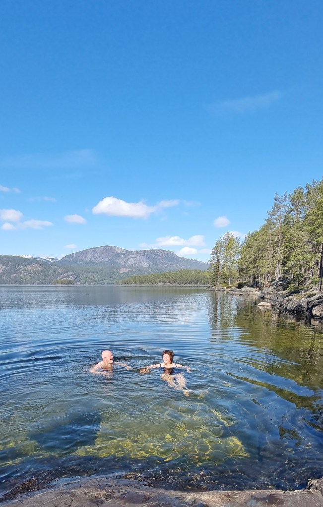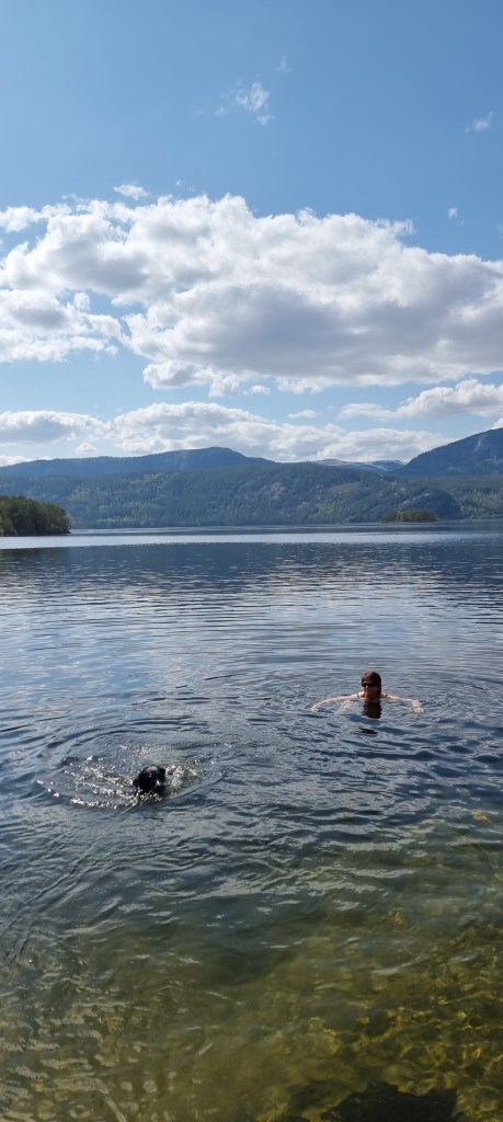 Så da ble det selvfølgelig et bad på Vidar, meg og Kira (Lena og Roy sin hund). Kira er gal etter vann!